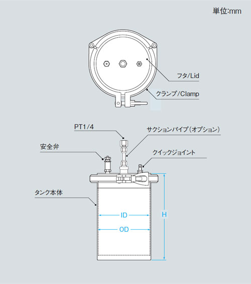 | 4.6 | SOT-4.6L | 266 | 159 | 165 | 8.7 | SUS304 | 0.5MPa | ・O形环(氟橡胶) 硅橡胶, 丁腈橡胶, 丁基橡胶) ・保险阀* ・快速结合 |