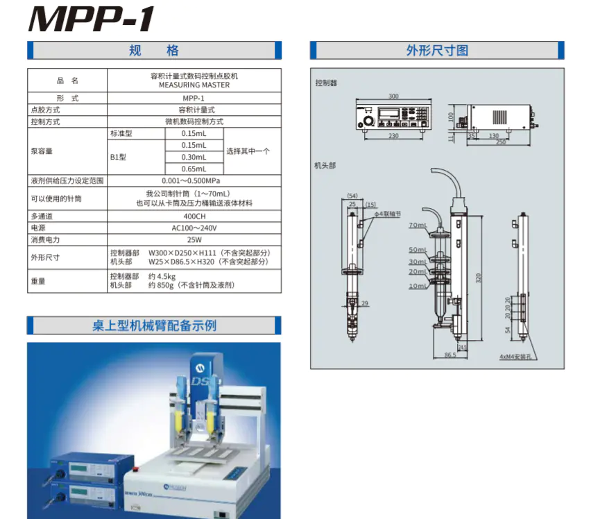 应对粘度变化胶液,高精度稳定吐出。 容积计量式武藏机械数控点胶机 MEASURING MASTER MPP-1